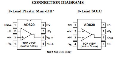 AD820AN features: (1)True Single Supply Operation: Output Swings Rail-to-Rail; Input Voltage Range Extends Below Ground; Single Supply Capability from +3 V to +36 V; Dual Supply Capability from 61.5 V to 618 V; (2)Excellent Load Drive: Capacitive Load Drive Up to 350 pF; Minimum Output Current of 15 mA; (3)Excellent AC Performance for Low Power: 800μA Max Quiescent Current; Unity Gain Bandwidth: 1.8 MHz; Slew Rate of 3.0 V/ms; (4)Excellent DC Performance: 800μV Max Input Offset Voltage; 1 μV/℃ Typ Offset Voltage Drift; 25 pA Max Input Bias Current; (5)Low Noise: 13 nV/Hz @ 10 kHz.